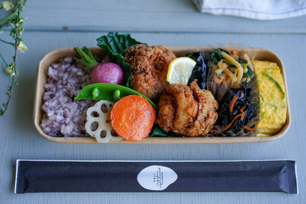 麹でふんわり仕上げた優しい味のミニKOJI唐揚げ弁当。彩り野菜とご飯をバランスよく詰め、冷めても美味しい。軽く食べたい時におすすめのお弁当。