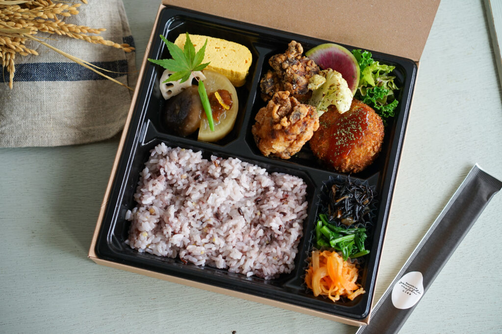 季節の恵みをぎゅっと詰め込んだ 季節の恵みバランス弁当。香り豊かな鮭のジェノバマヨ、麹でふんわり仕上げた唐揚げ、ふっくらだし巻き、チキンのトマト煮込みなど、主菜をしっかり楽しめる一箱です。副菜は発酵の知恵を生かした4種類を彩りよく添えて、栄養バランスと満足感を両立。