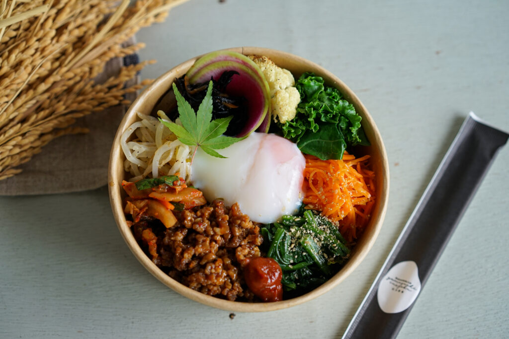 発酵の旨みをしっかり感じる 発酵ビビンパ弁当。季節の野菜を使った3種の自家製ナムルに、とろり温泉卵、麹でコクを出したプルコギそぼろ、自家製キムチを合わせた一品です。混ぜるほどに味わいが重なり、食べ応えがありながら後味すっきり。午後の仕事も心地よく進む、体に優しい満足ビビンパをぜひどうぞ。