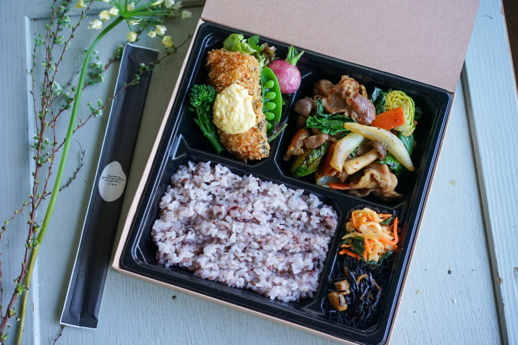 金時豚と春野菜の旨み炒めに、魚フライの自家製タルタル添え。季節の発酵副菜も入った、忙しい日にもご褒美にも嬉しい満足弁当です。